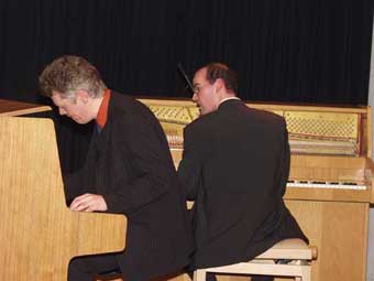 Frank Muschalle und Christian Bleiming in der Kulturschmiede Was ist besser als ein Pianist? Zwei, vor allem wenn sie vom Schlage eines Frank Muschalle oder Christian Bleiming sind. Die beiden Münsteraner Musiker sind in Greven keine unbekannten, hatten schon reichlich Auftritte bei der Kulturinitiative oder auch bei Swinging Greven. Nur im Duett waren sie in Greven noch nicht zu sehen, obwohl sie schon seit langem auch gemeinsam auftreten. Am Sonntagabend schlossen sie diese verbliebene Lücke in der Kulturschmiede unter den Augen eines rund 100-köpfigen Publikums. Man ist geneigt zu sagen, dass es Zeit wurde, beide Pianisten in Greven einmal gemeinsam zu sehen. Direkt zu Beginn zeigten mit einem Duett, wo der Vorteil von zwei Pianos gegenüber einem Soloauftritt liegt. Leider mussten die Zuhörer nach dieser flotten Einstimmung ein wenig warten, ehe sie wieder in der Genuss beider Künstler kamen. Den Blues und die Boogie-Woogies der 30er und 40er Jahre, den Bleiming und Muschalle präsentierten, gab es bis kurz vor der Pause nur im Solo. Der Kollege verschwand jeweils hinter der Bühne: "Hinten gibt´s Schnittchen." Bleiming spielte neben Klassikern wie dem Honky-Tonk-Train-Blues auch flotte Eigenkreationen, wie zum Beispiel den Cow-Street-Blues in Anlehnung an die Münsteraner Kuhstraße. Und auch Frank Muschalle hatte seine Kreationen, darunter auch Klassiker von Pete Johnson, so weit überarbeitet, dass er sich zwischenzeitlich grinsend für den verminderten Wiedererkennungswert entschuldigte: "Da war auch wieder ziemlich viel Muschalle drin." Beide zeigten sich gewohnt virtuos an ihren Instrumenten, jeder der Musiker wäre einen Besuch des Konzertes wert gewesen. Dass sie aber beide da waren, machte den Abend nach den Soli zu einem unvergesslichen Erlebnis. Rücken an Rücken, teils gemeinsam, teils auch ein wenig duellierend begeisterten sie das Publikum mit ihren Duetten, darunter auch der 6th Avenue Express. Neben der natürlich verdoppelten Klangfülle war es auch die Möglichkeit zur Improvisation, die die Pianisten nutzten und damit eine ganz eigene Stimmung schufen. Ohne Zweifel ein mehr als gelungener Auftritt. Bleibt die Frage, die sich fast von selbst stellt, wen zwei Ausnahmepianisten auf der Bühne stehen: Welcher ist besser? Die Antwort ist so einfach wie salomonisch: Beide! Und zwar gemeinsam.