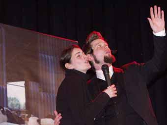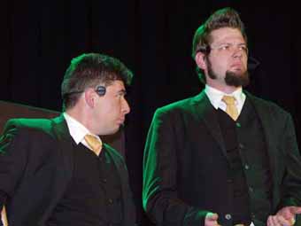 Onkel Fisch im Ballenlager Im Saal fieberten fast 300 jüngere Besucher, Durchschnittsalter um die 25 - dem Auftritt zweier Protagonisten entgegen, die wohl jeder vom Radiosender "Einslive" kennt, deren Auftritte mittlerweile Kultcharakter besitzen. Adrian Engels und Markus Riedinger, kurz Onkel Fisch genannt, hatten zum Angriff auf die Lachmuskeln angesetzt. Die Kulturinitiative hatte sie zum zweiten Mal eingeladen, diesmal versetzten die beiden ausgebildeten Schauspieler mit ihrem 7. Programm "Psychos- Denn sie wissen nicht, was das soll" das Ballenlager in Ekstase. Schon ihre erste Auftrittsnummer als siamesische Zwillinge, zeigte sie als wahre Meister ihres Fachs, als Samurai der Comedy. Denn sie agierten nicht nur als Doppeleuropameister im Synchronturmspringen mit Doppel-Achsel, mit ihrem sensiblen Kettensägenhumor präsentierten sie Anekdoten aus ihrem Leben als Alleinunterhalter, Höhen und Tiefen ihrer unsteten Schullaufbahn. Das Publikum hatte an diesem Abend selbstverständlich ein großes Problem. Denn so schnell, wie Adrian Engels und Markus Riedinger ihren Humor mit Vorschlaghammer, diesen gepflegten Klamauk auf Meeresspiegelniveau herabrieseln ließen, so schnell konnte man gar nicht zwischen den Lachanfällen atmen, es blieb einem wörtlich die Luft weg. Und in diesen 120 Minuten Anfall mit Pausenerholung gab es dann sämtliche Höhepunkte, die man erwarten konnte. Aus der "Grillstube Saloniki" war eigens der Besitzer, diesmal mit verhindertem Ehefrau-Monster, in eine mitternächtliche Fernsehtalkshow gekommen, die "Ragga-Muffins" verloren gänzlich spülmittelschnüffelnd jeden Kontakt zur Realität. Wer sie nur audiophil kannte, den überraschten sie mit einer Bühnenshow, die alle Erwartungen übertraf. Mit schräger Mimik und abgedrehtem Humor zeigten sie ein facettenreiches Talent, finaler intellektueller Kamikaze auf Spitzenniveau. Mit ihrem Auftritt als Schafe - nicht im Wolfspelz - gab es ein weiteres Highlight, aber richtig international wurde es dann bei vier Filmsequenzen nach Hollywood-Skripten. Wie multiple Persönlichkeiten wechselten Adrian Engels und Markus Riedinger beim Herausnehmen des Auflaufs aus dem Backofen vom Mond bis zum Irak. "Ein kleines Stück Käseauflauf für dich, ein großes Stück für die Menschheit. Kabarettistische Annäherungen gab es an diesem Abend selbstverständlich nicht, dafür aber einen Ausflug in die Welt des Zauberers von Oz, als Adrian Engels im Duett mit Nicole aus dem Publikum schallplattenverdächtig zur Ballade "Somewhere" ansetzte. Und als der gehörnte Markus Riedinger mal wieder die Welt als bemitleidenswert satanischer Höllenfürst zerstören wollte, gab es kein Halten mehr. Fast hätte man mit diesem geliebten Sataan Mitleid haben können, der trotz großem Auftrittsgebaren bei Rotlicht weder mit der Nebelmaschine noch mit seinen Flüchen zurecht kam. Scheitern im Angesicht eigener Nichtigkeit gepaart mit skurriler Sinnentstellung zog sich von den Anekdoten aus dem Leben des Türstehers Klaas "se Rock" Stöcksen bis zur Vernichtung der Titelmelodie der Maus. Das Kölner Duo gab in Greven einen Abend des Wahnsinns, perfekt inszeniert und trotzdem zu jeder Sekunde für eine Überraschung gut. Mehrere Zugaben musste Onkel Fisch spielen, erst dann verebbte der Jubel aus fast dreihundert Kehlen.