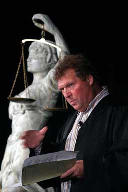 Thomas Freitag im Ballenlager Er klemmt den Kopf zwischen die Schultern. Schiebt den Unterkiefer vor. Winkelt die Ellbogen an, und es braucht gar nicht das polternde Grummeln mit bayrischem Akzent, um zu wissen: Es ist Franz Josef Strauß, der da in einen spillerigen, stotternden, jammernden Stoiber gefahren ist. Er ist dem Brandt, dem Willi, hinterher, als der sich wiedergebären ließ im Schröder Gerhard. Platz ist im Kanzler ja genug. "Nachdem ich die heiße Luft abgelassen habe, ist es mir fast zu luftig", knurrt der Willi. Als Parodist hat Thomas Freitag angefangen, jener Kabarettist, der am Samstag vor einem fast ausverkauften Ballenlager sein Publikum mit dem beschriebenen Kabinettstückchen faszinierte. Und dieses Metier beherrscht er noch immer unnachahmlich. Nur der Schröder, der geriet ihm ein bisschen blass. Vielleicht hat die Vorlage nicht genug Ecken und Kanten. Das kleine Politikerquartett war nur eine der vielen Episoden, die Freitag geschickt in die Rahmenhandlung einer Gerichtsverhandlung verpackte. Peter Holzer, der sich selbst "Che Güllevara" nennt, hat dem Finanzminister ein paar Tausend Liter Gülle ins Dienstzimmer gekippt, um sich gegen den Ruin durch allzu hohe Steuern zu wehren. In immer neuen Szenen, temporeich vor allem im ersten Teil der Show, schildert Freitag, wie dem Bürger heutzutage gar nichts mehr bleibt, als mit "merde", wie er sich vornehm ausdrückt, zu werfen, um seinen Unmut kundzutun. Wählen? Auswandern? Alles keine rechte Alternative. Darum - "Freispruch, Euer Ehren." Ein Höhepunkt der Show war gewiss das Opern-"Multinett" in Halb-Playback zur Ich-AG. "Morgen, Chef", begrüßt die Sekretärin und klagt in hohem Sopran, dass der Aquisiteur, der faule Hund, noch keinen Handschlag getan hat. "Ich muss sofort ein ernstes Wort mit mir reden", grummelt der Chef in tiefem Bass. Ein Betriebsrat fordert in einer Kakophonie dies und das, schließlich kündigt dem armen Ich-AGler die Frau die "Wir"-AG. Er überredet deshalb seine Sekretärin zu einem romantischen Dinner, und dann "kuschel ich ein wenig mit mir - aber mit Kondom." Immer hektischer wird d er Geang, schneller wechseln die Personen, immer schräger wird ihr Gespräch. Und dazwischen, wie ein Leitmotiv, schrill und drängend: "Schefe, ich wolle putz!" Klar, neben solchen Bonbons gab es auch einige Längen. Das Tagebuch des Mallorca-Auswanderers, die Eingliederung Lummerlands in die EU fielen gegen den rasanten ersten Teil ein wenig ab. Aber selbst in diesen Passagen gab es so viele witzige, treffende Sprüche, dass Freitag immer wieder Gelächter erntete. Eine Kostprobe? "Wer das Tarifsystem der Bahn durchschaut, bekommt automatisch Abitur."