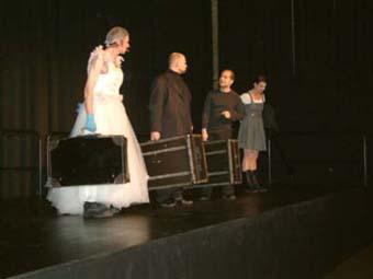 Münchener Lach- und Schießgesellschaft Sie waren wirklich zum Schießen. Anders kann man es nicht ausdrücken. Bezaubernd, verrückt, nachdenklich, aggressiv, turbulent und zum Lachen. So präsentierte sich die Münchener Lach- und Schießgesellschaft vor vollbesetztem Ballenlager. Mit Witz und Charme spielten sich die vier Darsteller in die Herzen der Zuschauer und sorgten für begeisterten Applaus. Schlag(anfall)artig ging es plötzlich los, mit der kleinen Dorothy, die zum Zauberer von Oz will, damit sie wieder nach Hause kann. Auf ihrem Weg begegnen ihr zahlreiche Gestalten, die ihr helfen wollen und auch die böse Hexe des Westens, die ihr angeblich schaden will. Auf liebenswürdige Art und Weise führte das Polit-Theater mit Kabarettanlehnung und Comedy-Auszügen durch die Abenteuer der kleinen Dorothy und sorgte dafür, dass die Politik kräftig durch den Kakao gezogen wurde. Hartz IV, der Fall der Mauer, Schröder, Merkel und Stoiber, Westerwelle und Co, die Gesundheitsreform, Emissionsrechte und Dritte-Welt-Länder: alles musste dran glauben. Herr der Ringe-Verulkungen und Abfälligkeiten über TV-Richterin Barbara Salesch hatten einen wahren Sturzbach an Lachtränen zur Folge. Echt! Ehrlich! Johannes Rau, Johannes B. Kerner und Johannes Beer-Saft bekamen ihr Fett ebenso weg wie Rudolf Scharping und die Telekom. Das ist professionelle Gehirnlosigkeit, lacht die Vogelscheuche und grinst dümmlich. Die Stimmvariationen der vier Darsteller waren allein schon den Abend wert. Mal stand ein erschreckend realistischer Hitler mit rollendem R auf der Bühne, dann die piepsig-tuntige Fee Glinda, ein verschreckter und gleichzeitig arrogant brüllender Herrscher-Löwe und ein schnarrender, verrosteter Blechmann. Statt gegen Hunger, Wassermangel und Analphabetismus zu kämpfen, fliegen die Helden lieber zum Mars: Ist zwar teurer, sieht aber besser aus. Drei, zwei, eins, Bus(c)h! Wie gehts jetzt weiter?, fragt irgendwer in die auftretende Stille. Weiß ich nicht, guck mal in die Regieanweisungen. Ein schneller Blick ins weiße Heft, dann: Du bist tot... steht hier jedenfalls so! Was? Nein, keine Angst: niemand stirbt wirklich. Höchstens vor Lachen. Echt! Ehrlich!