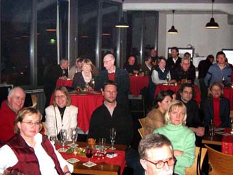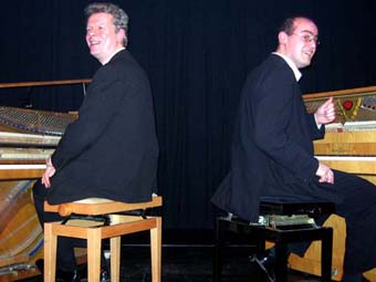 Muschalle und Bleiming in der Kulturschmiede Natürlich geht es nicht darum, wer der Bessere ist. Doch wenn zwei Musiker, die eine ähnliche Stilrichtung pflegen, sich gemeinschaftlich, aber auch getrennt dem Publikum stellen, drängt sich schon ein wenig die Frage auf: Wo liegen die Unterschiede, wo die Gemeinsamkeiten? Fangen wir an bei den Äußerlichkeiten: Beide im schwarzen Anzug, Frank Muschalle ohne, Christian Bleiming mit Krawatte. Der eine mit etwas schütterem Haaransatz, der andere grau meliert. Die Schuhe: bei denen hätte auch der beste New Yorker Shoeshiner nicht mehr Glanz hervorzaubern können. Aber derlei Attribute waren es natürlich nicht, die die rund 70 Besucher zum letzten Konzert der Kulturinitiative anno 2005 in die Kulturschmiede gelockt hatten. Sie wollten sich vor den besinnlichen Klängen der Weihnachtstage mit Guter-Laune-Musik die Ohren freipusten lassen. Und ihre Erwartungen wurden nicht enttäuscht. Denn Bleiming und Muschalle boten sowohl solo als auch im Duett das, was das Publikum hören wollte: Boogie-Woogie vom Feinsten. Dabei ist der Boogie-Woogie eine Stilrichtung, die unter den Händen weniger versierter Musiker durchaus auch mal in einen Langeweile erzeugenden musikalischen Einheitsbrei abdriften kann. Doch nicht so bei Bleiming & Muschalle. Ihr fingerfertiges Pianospiel zaubert selbst bei den rasantesten Stücken noch feine rhythmische oder melodische Nuancen hervor. Womit wir auch schon bei den musikalischen Gemeinsamkeiten und Unterschieden wären. Die sind zwar nicht groß, aber durchaus hörbar. Bleiming ist der direktere, rhythmusbetontere Pianist, während Muschalle den etwas melodiöseren Stil pflegt. Was nicht heißt, dass der Drive fehlt. Dafür sorgt schon die gute Bein- oder besser Fußarbeit wenn nötig, ersetzt eben kräftiges Stampfen den fehlenden Trommler. Wer war denn nun der Bessere? Salomonisches Urteil: im Duett, nicht im Duell, sind Bleiming & Muschalle ein unschlagbares Boogie-Woogie-Dreamteam. Auch den Zuhörern wars letztlich egal. Hauptsache die Ohren waren frei für Stille Nacht, heilige Nacht.