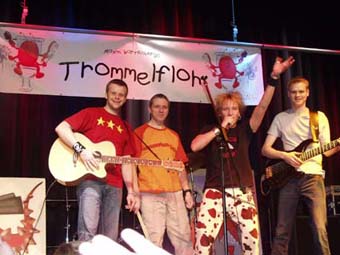 Trommelfloh im Ballenlager Den Schweinachtsmann kennt man in Greven, aber was ist denn nun der Trommelfloh? Am Sonntagnachmittag stürmten über 380 kleine und große Besucher das Ballenlager, um ein Rockkonzert der besonderen Art zu erleben. Die Kulturinitiative hat es sich zum Ziel gesetzt, besonders hochwertige Angebote für den Nachwuchs anzubieten. Und so kam man um die Münsteraner Gruppe "Trommelfloh" mit ihrem Leadsänger Maxim Wartenberg nicht vorbei. Nach seinen großen Erfolgen u.a. beim Nürnberger Bardentreffen und in Münsters Jovel hat der "Trommelfloh" auch in Greven sein Publikum begeistert. Denn mit Charme, Leichtigkeit und ohne den bei Kinderliedermachern oft üblichen "erhobenen Zeigefinger" wollte man nicht moralisieren, sondern mit guten Texten, eingängigen Melodien und hochwertiger Musik absolut sehens- und hörenswert unterhalten. Zur Verkürzung der Wartezeit bzw. zur Einstimmung konnten sich die Kinder im Vorfeld schminken lassen, vom ersten Ton des Konzertes an war klar, dass der 28jährige Vater von vier Kindern und seine drei Mitstreiter wissen, was bei den Kids ankommt. Von Rock bis Latino vermischten sich die Musikstile, allen gemeinsam war, dass sich die Lieder leicht mitsingen ließen. Und immer wieder bezogen Maxim Wartenberg, Matthias Börste, Markus Hannes und Stephan Weber alle ein. Zur Unterstützung des Piratenchores brauchte er die Väter, so dass "Seeräuber Jack" mit großer Besetzung den Saal erfüllte. Der "Trommelfloh" machte Musik für Kinder, aber eben solche, die ihrer Erlebnis- und Fantasiewelt entspricht. Die sie ernst nahm, ohne sie bestimmen zu wollen. Es gibt eben kleine grüne Monster, deren Zuneigung man gewinnen kann, zumal wenn der "Trommelfloh" die Unterstützung der kleinen Esther hatte, die perfekt in die Musikgruppe integriert war. Und so begeisterten sie mit Liedern wie "Wackelzahn", "Kai, der Gemüsemann", "Wochenende" und "Menschenkinder" - mit perfekter Bühnenshow, die durch das Geschehen im Publikum mitreißend ergänzt wurde. Man sah in diesen zwei Stunden neben den vielen strahlenden Kinderaugen auch unzählige Eltern, die sich dem "Trommelfloh" nicht entziehen konnten. Da wurde gesungen und getanzt, es herrschte eine Stimmung geprägt von Spontaneität, Lebendigkeit und Kreativität. Nicht viele Requisiten brauchte es, eine blaue Perücke des Gittaristen und eine Piratenfahne entführten in die Welt der Seeräuber und Abenteurer, ein Stern entführte in den "kleinen Traum". Die Fantasien der Kinder hat der "Trommelfloh" musikalisch hochwertig umgesetzt, eine Qualität bewiesen, die in diesem Metier oft vernachlässigt wird. Viele neue Fans hat er an diesem Nachmittag gewonnen.