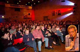Konstantin Wecker im Ballenlager Seiner Bronchitis sei Dank. Hörbar rauer kommen die mal im rhythmischen Stakkato, mal in weichen lyrischen Songs gesungenen Botschaften des engagierten Liedermachers rüber. "Ich singe, weil ich ein Lied hab'", teilt Barde Konstantin Wecker seinen Zuhörern im Baumwoll-Ballenlager zu Greven mit. Und 500 Menschen spüren in der ausverkauften Industriehalle, dass Wecker auch nach Jahrzehnten noch viele Lieder hat. Wer Weckers Konzerte in diesen Zeiten besucht, weiß, worauf er sich einlässt: Die Regenbogen bunte "Pace"-Fahne am Flügel bekommt eine Stimme. Seine Stimme, die laut, aggressiv, unnachgiebig, aber überzeugend die Botschaft gegen diesen Krieg wie gegen jeden Krieg erhebt. Willy, alter Kumpel aus 68ern, erlebt im bluesigen Gespräch die Wiederauferstehung. Dem Willy erzählt er von "gehirngewaschenen Verbrechern", die das World Trade Center in die Luft gejagd haben und prangert dann im Talking Blues jene an, die die Freiheit verteidigen. "Die des Geistes oder vielleicht nur die des Marktes?" Seine Antwort singt er in vielen Liedern, etwa im Waffenhändler-Tango, in der ein blühender Industriezweig stets selbst den Produktion-Boom erzeugt. Böse sind Weckers Texte fast immer, ganz böse aber, wenn Amerika, das "Saddam zum hausgemachten Frankenstein" aufpäppelte, in des Sängers Fokus gerät. Dann singt er sich in Rage, Hände krachen in die Tasten, verstärkt durch den Oberkörper, den es nicht mehr auf dem Hocker hält. Töne und Worte branden bis in die letzte Sitzreihe. Doch Wecker hat an diesem Abend viele Gesichter: Als Rezitator eigener Poesie, die sich frei zwischen skurrillen Morgenstern-Adaptionen und Brechtscher Diktion bewegt. Als Liebeslieder-Sänger zwischen Melancholie, Hingabe und Schwermut. Als Sänger, der gar häufig mit den Schwächen des Alters kokettiert und als Mensch, der in der eigenen Vita manches Mal die hehren Ideale seiner Lieder nicht erreichte.