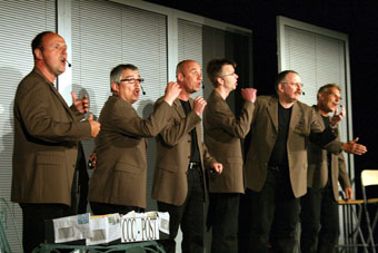 CaleCopfCompany im Ballenlager Trifft man die sechs sympathischen Herren auf der Straße, sind sie ganz normale Menschen. Aber wehe, sie sind losgelassen. Etwa auf der Bühne des Ballenlagers am Samstagabend. Dann verwandelten sie sich in die Cale-Copf-Company, jene sagenumwobene A-Capella-Formation mit durchschlagendem Erfolgskonzept. Da bebte das ehrwürdige Gemäuer. Die Kulturinitiative hat dank ihrer guten Kontakte zu den Künstlern dem Publikum ein musikalisch unterhaltsames Geschenk der Extraklasse präsentieren können. Auch in ihrem Jubiläumsjahr, schließlich feiert C.C.C. in Halle im September ihr 15-Jähriges, haben die Sänger nichts von ihrer Frische und Lebendigkeit verloren. Sie sangen sich direkt in die Herzen der über 250 Besucher, die fasziniert waren von der exzellenten Musik und der mitreißenden Bühnenshow. Freude am Gesang ließ den Funken überspringen, ihren Stimmbändern entlockten sie in rasanter Folge diverse Ohrwürmer. Dabei unterlegten sie diese Hits mit speziellen Texten, deren hintergründiger Humor sogar einem Woody Allen Konkurrenz macht. Verwandlungskünstler sind sie sowieso. Sie schlüpften in Rollen und Personen, die man an diesem Ort sicherlich nicht erwartet hätte. Stevie Wonder besuchte da das Ballenlager, offenbarte seine geheime Leidenschaft bei Music was my first love. Die Bee Gees feierten ein Wiedersehen mit einem rasanten Querschnitt ihres Repertoires, wobei Ali Sieckmann zu ungeahnten stimmlichen Höhen auflief. Eingefleischte Fans wissen die Leistung der C.C.C. zu würdigen, schließlich zählt die rote Odessa-LP zu den musikalischen Kostbarkeiten des Trios. Zwischen Fanpost und gegenseitiger Neckerei gab es ein Elton John-Medley, das so auch in jeder Weltmetropole für Begeisterungsstürme gesorgt hätte. Das Erfolgsgeheimnis der C.C.C. wurde deutlich: Musik erklingt auf sehr hohem Niveau, ausgefeilte Arrangements und intensive Ausgestaltung bilden bei aller Hemdsärmeligkeit die Grundlage guter Unterhaltungskunst. Als Beispiel höchster Gesangskultur präsentierten sie in Perfektion ein Andrew-Lloyd-Webber-Medley. Dazu kam ein gehöriges Maß an Komödiantentum, Spontanität und feinsinniger Situationskomik. Ihre Streiche gingen von Udo Jürgens - Ich war noch niemals bei McDoof - bis zu Jethro Tulls Locomotive Breath mit stimmlicher Unterstützung des Publikums. Michael Wolf mit Perücke und goldenen Armbändchen als alternder Frauenheld Howard Carpendale eroberte im Sturm die Herzen des weiblichen Publikums. Seinem Charme erlag jede Frau bei Hello again, das mit einem chorischen Hau ab Howie untermalt war. Mit ihren Zugaben entlockten sie dem Publikum nochmals kräftige Ovationen. Von diesem Abend möchte niemand auch nur eine Minute missen.